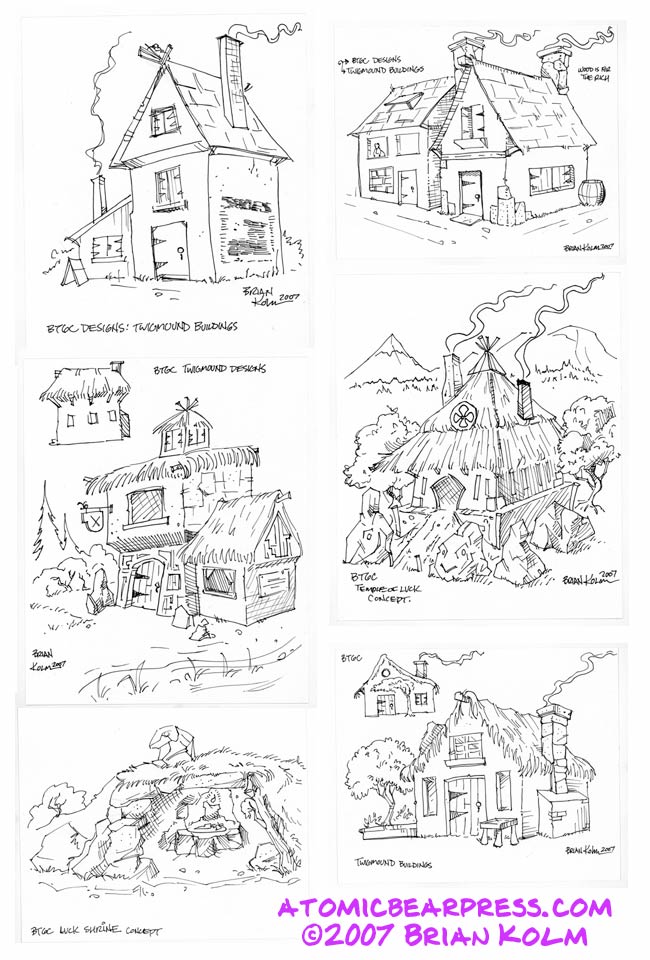 These are concepts of possible building in my Graphic Novel. I am trying to find a way to avoid fairy tale buildings that look like there a rip-off of Disney’s Pinocchio. Click for a bigger image.