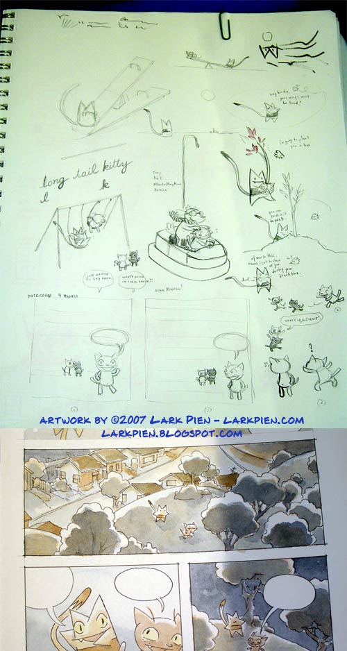 She also had her sketchbook open and I snapped a picture of some of her development sketches for a new project. She also had a finished painted page for a possible new Long Tail Kitty book for a local publisher.