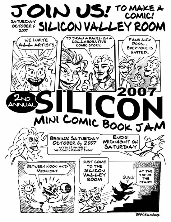 I created the flier for Silicon 2007 Comic Jam. Drawn inPen and ink with text and graphics in Photoshop. I tried to make sure that each panel could have been drawn by different artist.
