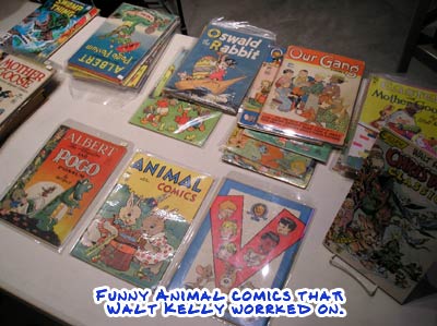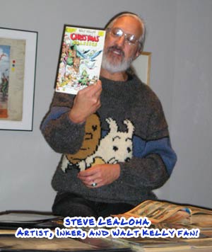 Steve Lealoha is the talented artist and comic book inker(Fables from Vertigo/DC) and has a large collection of comics featuring the work of Walt Kelly. Kelly did a lot of work on the funny animal genre of comic books including the Our Gang (Little Rascals) comic stories. Steve even did a cover for a collection of Kelly’s non-pogo work in the mid 1980’s. Some of the books he brought are in a picture below.