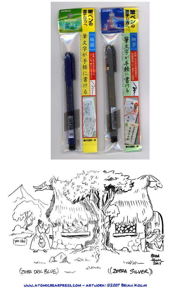 I have inked most of my comics books with an excellent pen from Japan with the brand name Zebra. It’s the silver one in the photo above. The pen in fantastic since it has a brush tip and the ink can take washes of paint on top. I just bought a thiner point pen from the same brand and I did the above test.
