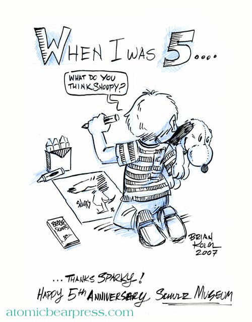 This is the drawing that I created for the Schulz Museum’s 5th anniversary from the theme “When I was 5….” I really did have a stuffed snoopy (still do) and I really did draw snoopy at a very young age.